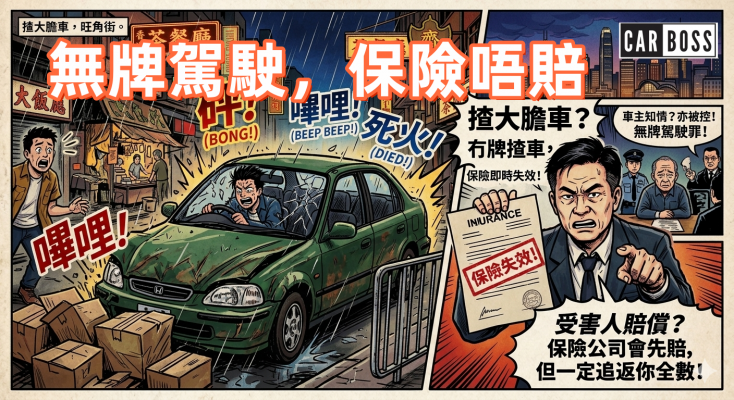 - 刑事檢控:若車主明知或疏忽讓無牌人士開車,會被控「容許他人無牌駕駛」及「在沒有第三者保險下使用車輛」。